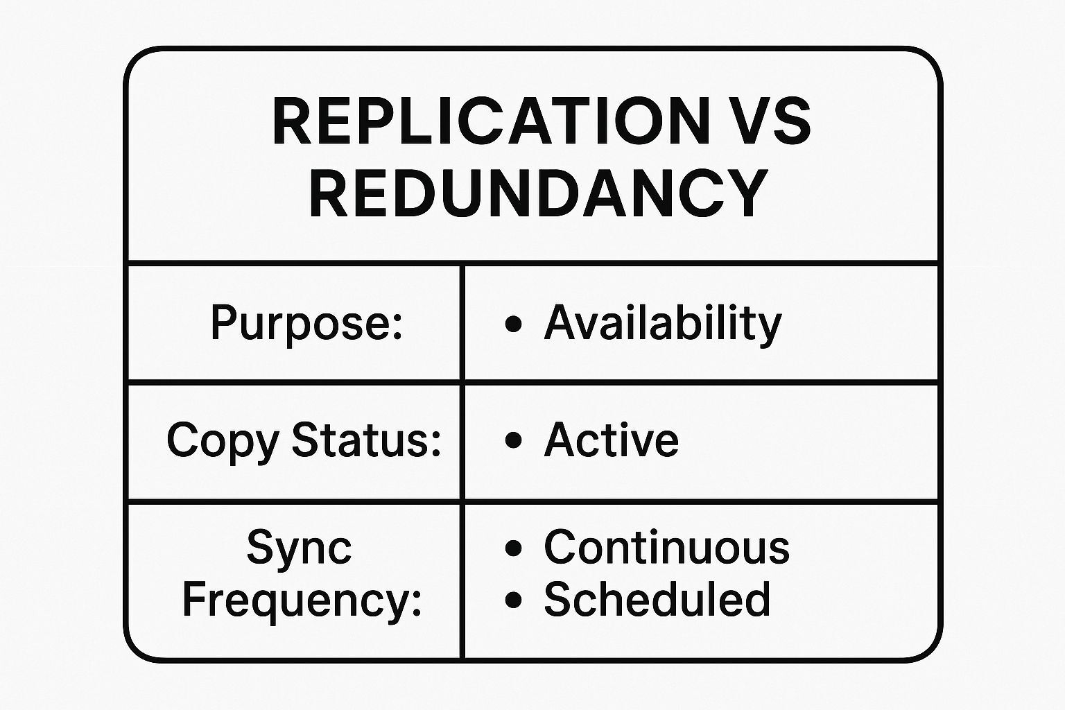 Redundancy is about recovery. It’s a reactive safety net. Replication is about proactive availability and performance. It prevents users from ever noticing an outage in the first place.