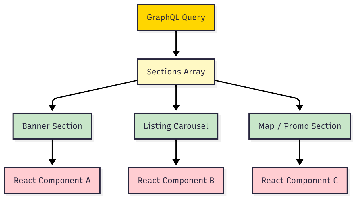 Instead of the frontend hardcoding page layouts, the backend sends a list of “sections” that describe what should appear on the page. Each section represents a UI block, for example, a banner, a list of homes, a map, or a recommendation card.