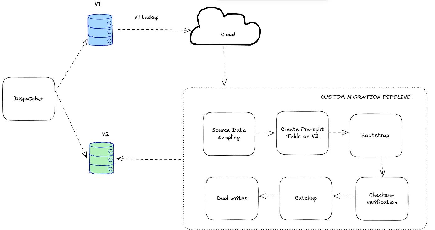 To work around this, the team built a custom migration pipeline that could bootstrap tables into v2 and keep both systems synchronized during the transition.