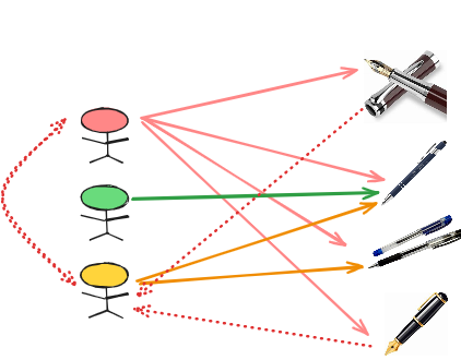 In this example, since the first two person choose the first pen and the third pen is selected by all three person, the system would recommend the first pen to the third person, recognizing their shared preferences.