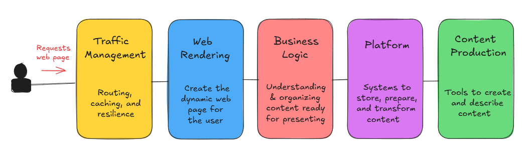 The Web Rendering Layer only handles how the website looks. It still needs to fetch data (news articles, videos, weather, etc.), and that’s the job of the Business Layer.