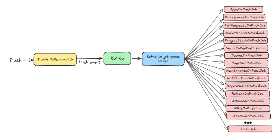 GitHub uses an internal system that listens to Kafka events and triggers the right background jobs when a new push event arrives. It’s like a smart dispatcher: