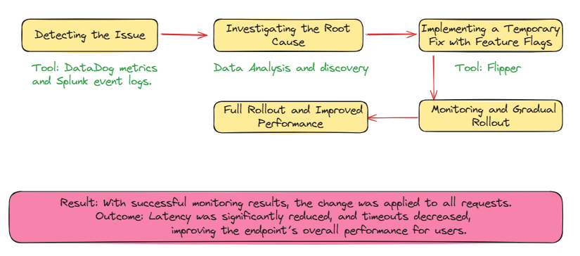 After digging into the slowest requests, they discovered that this endpoint was performing an unnecessary access check, which was slowing down response times. To address this, GitHub created a feature flag with Flipper to skip the access check on a small number of requests. As the team monitored metrics and confirmed latency improvements, they ramped up the change, eventually applying it across all requests.