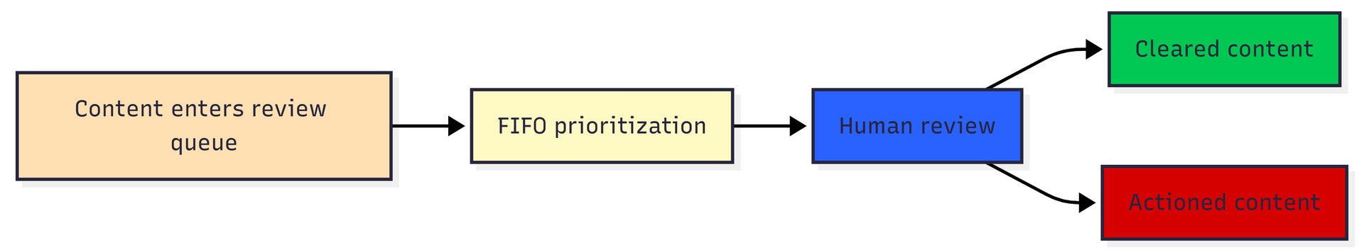 Dynamic, not static: The old system used fixed buckets with predefined SLAs. The new framework dynamically moves content up or down the review queue based on how likely it is to violate policy.