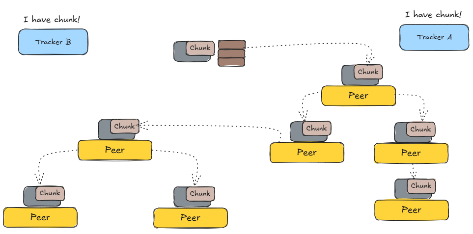 When a machine needed a file, it didn’t request it directly from the storage system. Instead, it contacted a tracker, which maintained a list of machines that already had the file.