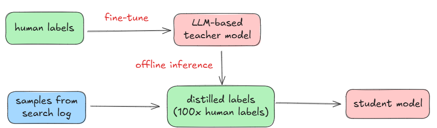 Now that we know how Pinterest uses a powerful LLM-based cross-encoder model (called the teacher) to figure out how relevant a Pin is to a user’s search. While this model is super accurate, it’s also too slow and expensive to run in real-time for every search.