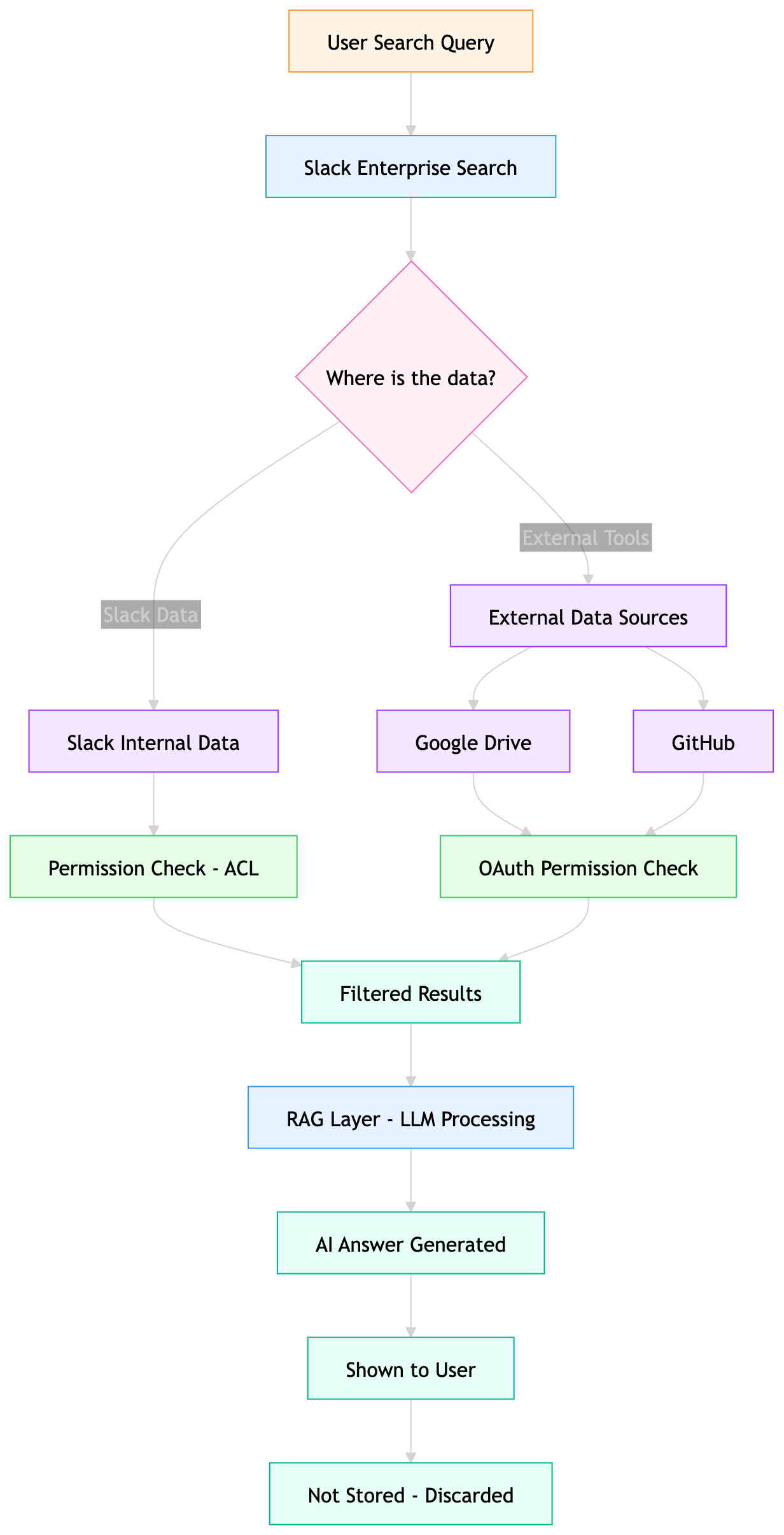 One of the biggest design decisions Slack made for enterprise search was this: Don’t store external data at all. Most systems would copy data from tools like Google Drive or GitHub, index it, and store it internally. Slack chose not to.