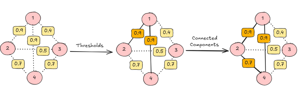 Each edge is weighted by a similarity score; we identify clusters by finding connected components in the resulting graph.
