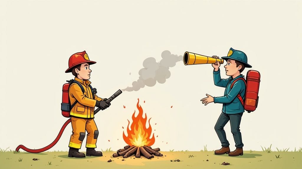The table below breaks down how teams approach common system issues when they're limited to monitoring versus when they have a true observability practice. Notice how the focus shifts from reacting to dashboards to proactively exploring data.