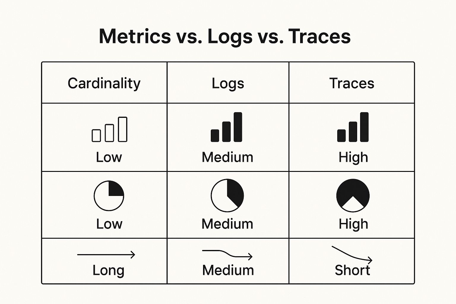 This chart shows how different telemetry types fit various tasks. Traces, with their detailed context, excel in identifying issues in distributed systems, unlike low-cardinality metrics.