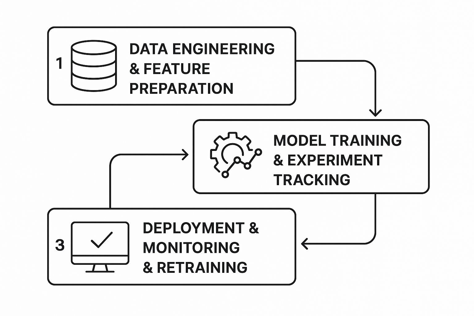 Monitoring tools alert when accuracy drops or data shifts, triggering a new retraining job with updated data. This automated cycle keeps the churn predictor dynamic and valuable.