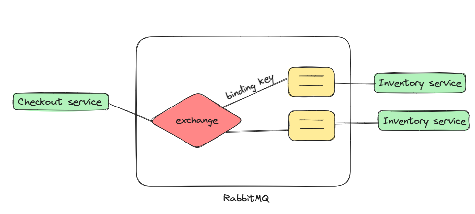 In this messaging model, the producer (in our case, the checkout service) sends messages to an exchange instead of directly to a message queue. Think of the exchange as a post office: it receives all the messages and distributes them based on their addresses. An exchange can connect to multiple queues. For our example, we'll connect it to two queues: one for inventory and one for shipping. The checkout sends a message to the exchange, which uses bindings (connections identified by binding keys) to link to the queues. The consuming services, like inventory and shipping, then subscribe to these queues to receive messages.