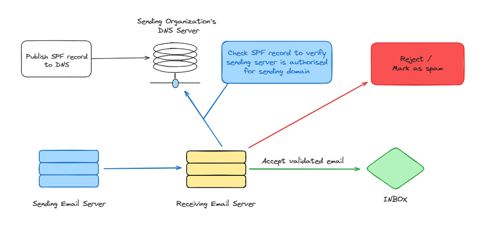 So when you're setting up SPF you'll publish your SPF record to DNS to the sending organization's DNS server and then when an email is sent out from your domain the receiving server receives it and performs an SPF record lookup by querying DNS for the SPF record of the ascending domain to verify whether it came from an authorized sending server or IP address and then if there's no SPF record or if the SPF record of the domain specifies that the server that the message came from was not authorized to send on behalf of that domain then the message can be rejected or marked as spam or if it passes SPF validation then the message can be accepted for delivery by the receiving email server and then sent into the recipient's mailbox now!